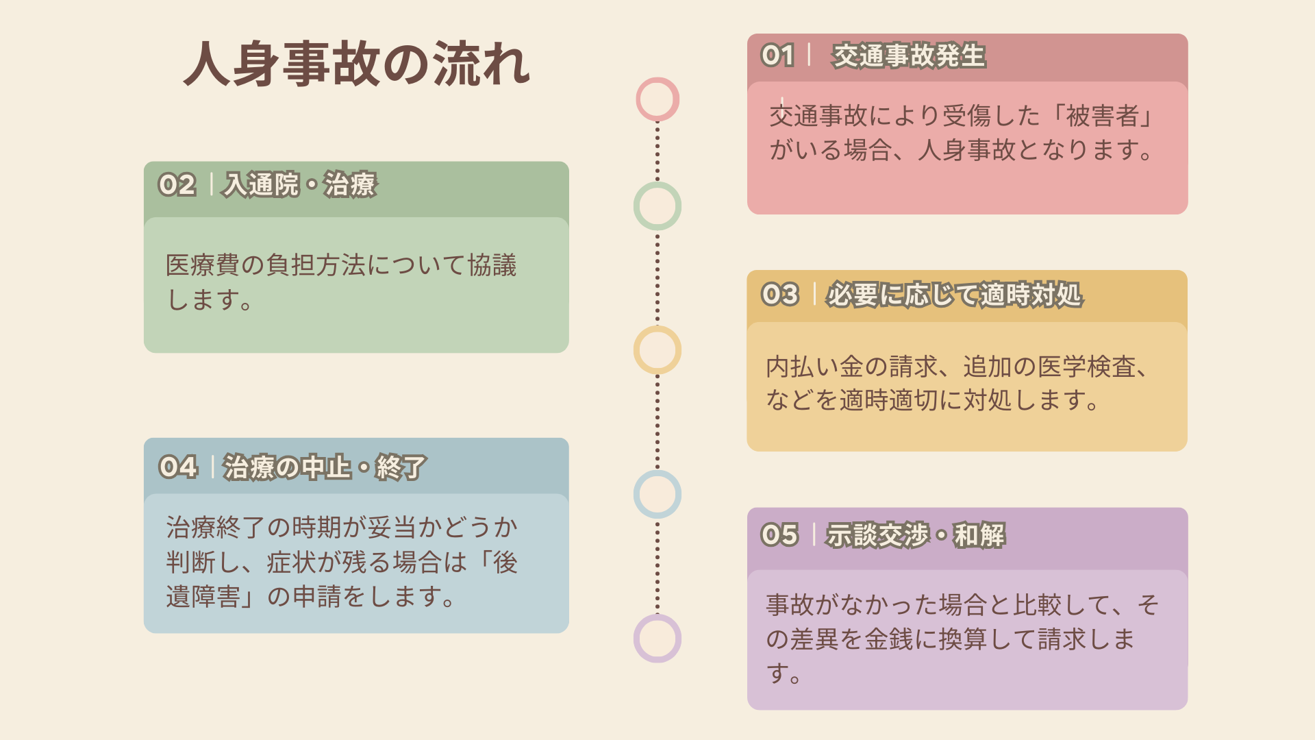 このページでは「事故発生から解決までの流れ」を被害者視点人身事故と物孫事故に分けて説明いたします。
